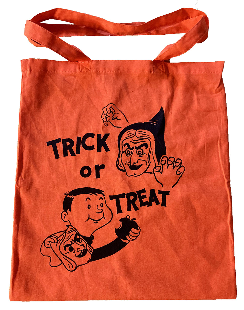 The world-famous "Trick or Treat" graphic, now available in tote form! Hand screen printed on orange canvas tote bag measuring 15" x 16". Ideal for carrying your Halloween candy or all your favorite Works of Love publications!